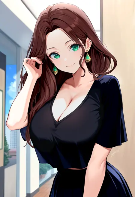 MISC: mldornd, brown hair, cleavage, green eyes, large breasts, long hair