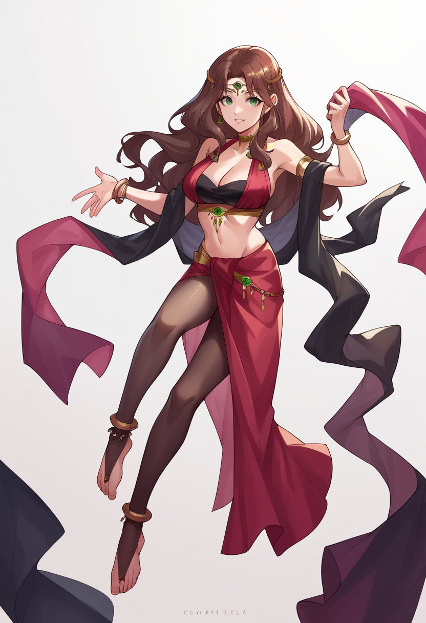 어두운 사막 의식 (플레지안): mldorplg, 발목장식, 반바이, 맨발, 팔찌, 원형 머리장식, 녹색 눈, 헬터넥, 보석, 큰 가슴, 긴 머리, 복부 노출, 팬티스타킹, 빨간 상의, 겉옷, 그라데이션 복장