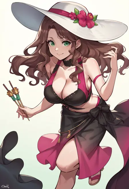 여름: 검정 비키니, 갈색 머리, 녹색 눈, 하이힐 샌들, 보석, 긴 머리, 사롱, 해변 모자, 그라데이션 복장, 분홍 스트랩, 어깨 노출, 소매 없음, 머리핀, 검정 모자, 분홍 헬터