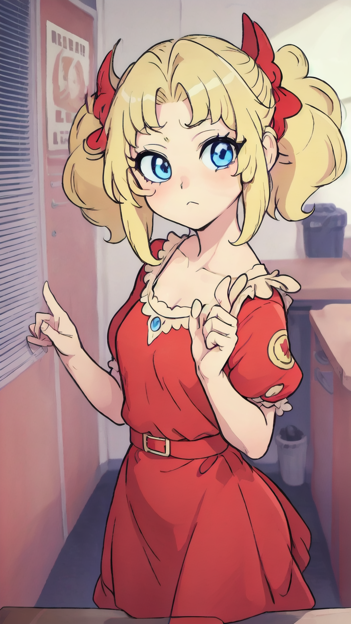 lora:Sandy(Kassos):1, blond hair, standing, blue eyes, red dress, looking at viewer, smile, red ribbon, medium breast