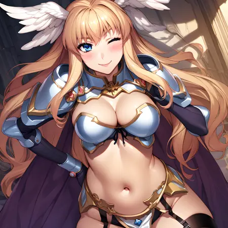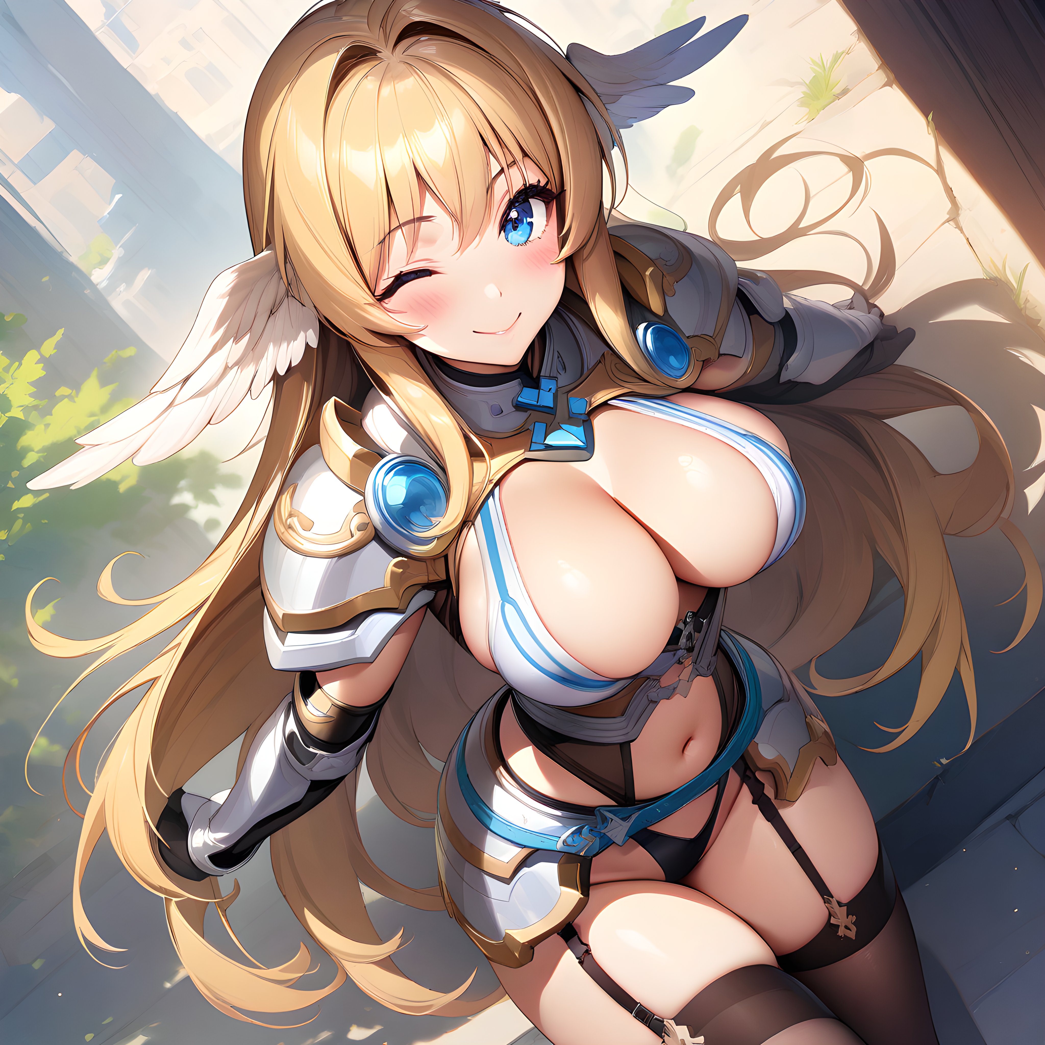 활성화 태그는 "rune knight", 복장 태그는 "breasts, thighhighs, armor, cleavage, pauldrons, navel, garter straps"입니다.