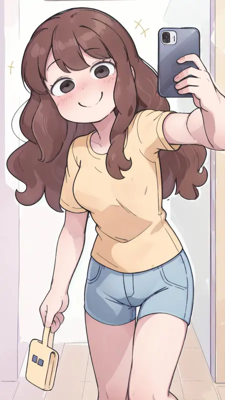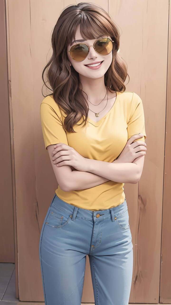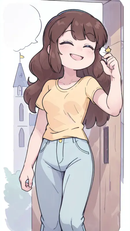 lora:Lelay:1, 棕色头发,棕色眼睛,黄色衬衫,牛仔裤,蓝色裤子