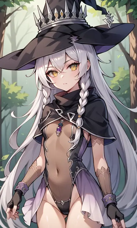 hilda, hat, witch hat, fingerless gloves, jewelry, black gloves, leotard
