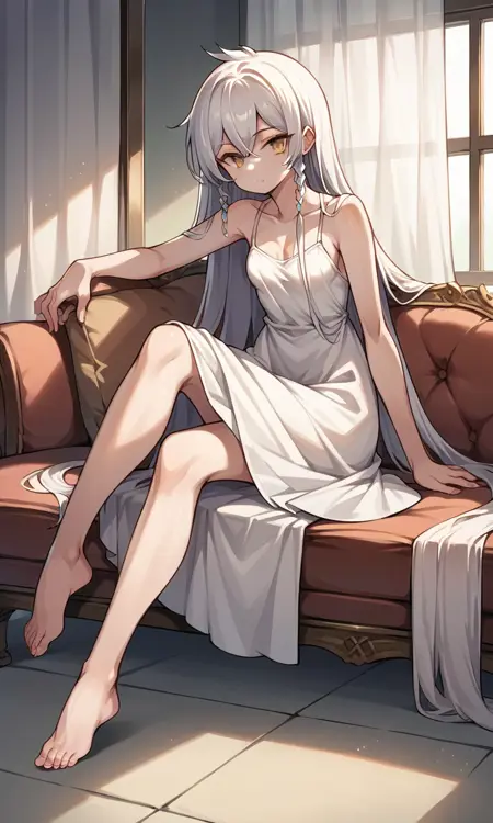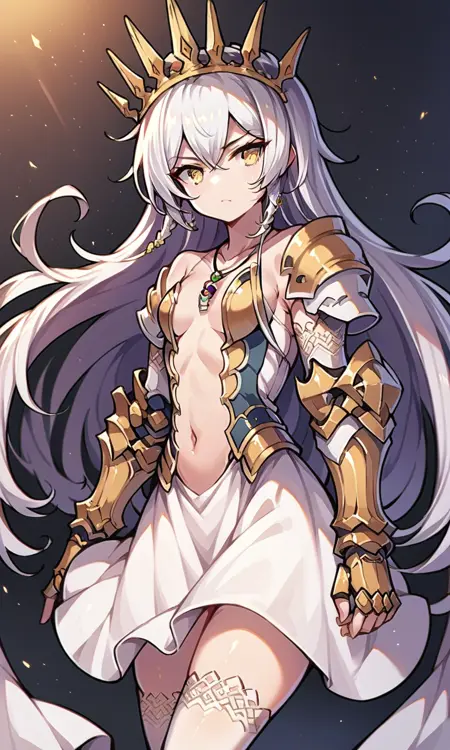 hilda_light, yellow eyes, crown, white thighhighs, white dress, armored boots, gauntlets, necklace, inner side boob, navel,