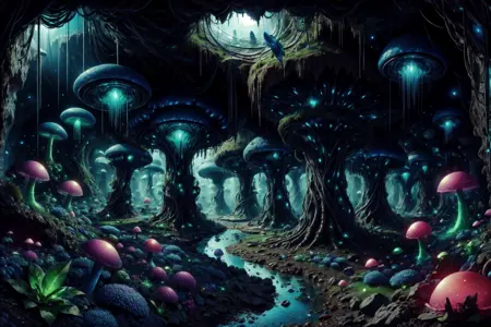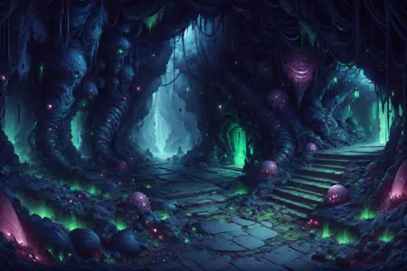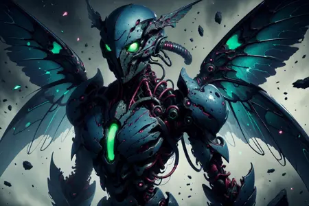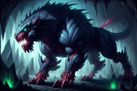 几丁质,科幻,地下,粗糙锯齿纹理,深蓝色外骨骼,肉质关节,绿色发光,绿色眼睛,