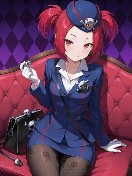 Tags (clothes): handbag,blue headwear, blue jacket, white shirt, blue pencil skirt, white gloves, skull print pantyhose
