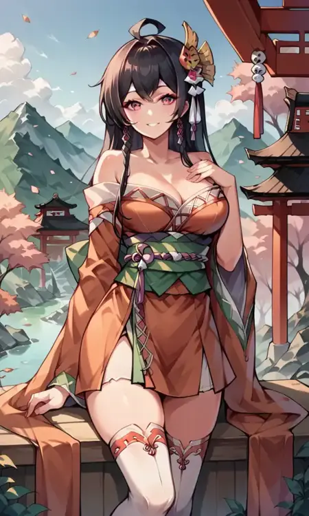 sakuya, clevage, off shoulders, large breasts, hair ornament, magenta eyes, white thighhighs