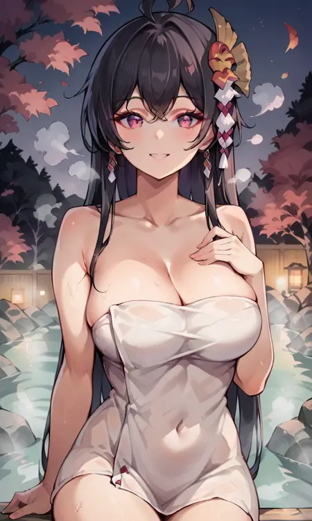 sakuya, clevage, off shoulders, large breasts, hair ornament, magenta eyes, white thighhighs