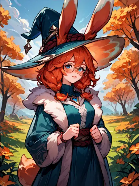 衣装プロンプト: green cloak, fur trim, hood up, hood down, round eyewear, earrings, opaque glasses, white gloves, fingerless gloves, alternate costume, witch hat