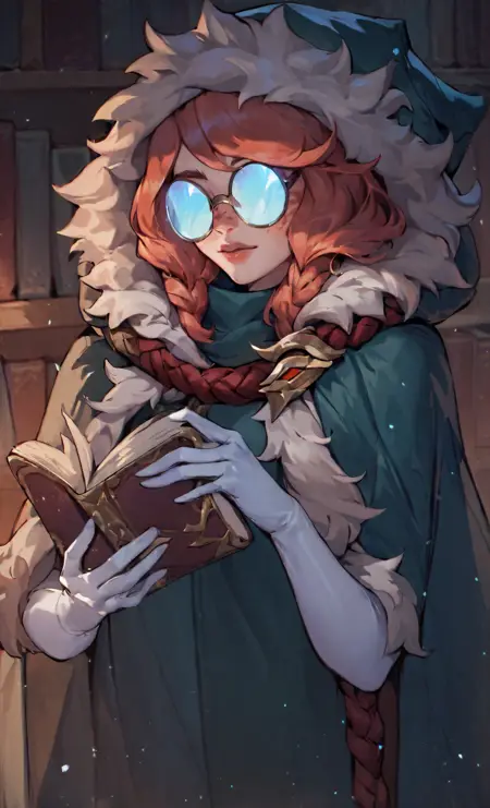 服装提示词: 绿色斗篷、毛皮镶边、帽子戴起、帽子放下、圆形眼镜、耳环、不透明眼镜、白色手套、露指手套、替换服装、女巫帽