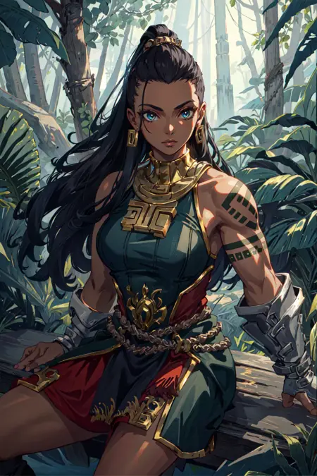 태그: illaoi, 1girl, 다크 스킨, 긴 머리카락, 근육질