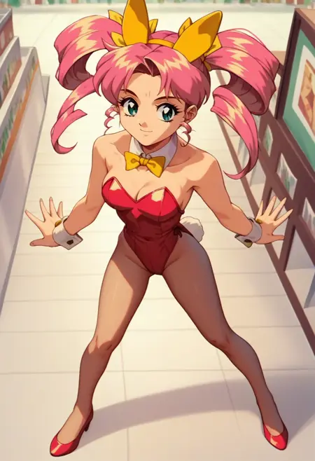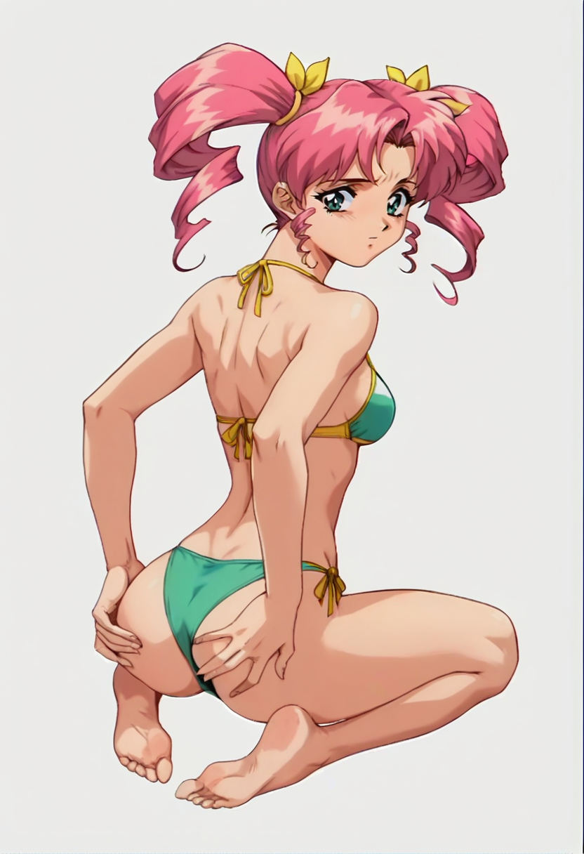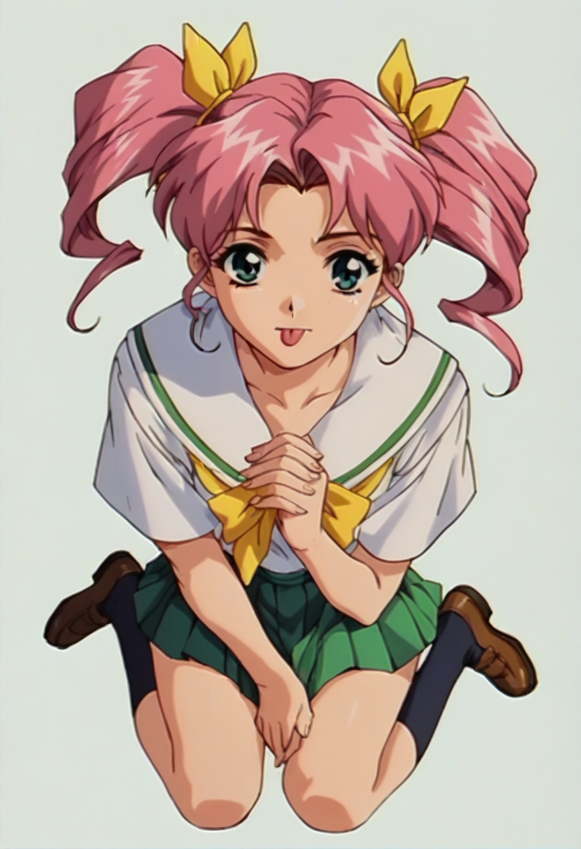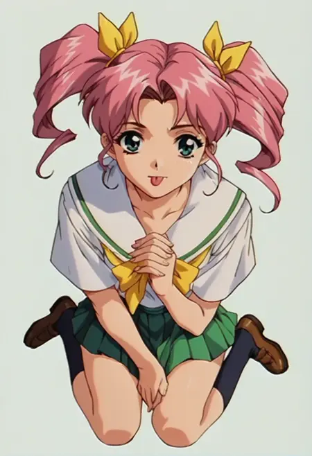 1girl, looking at viewer, green eyes, pink hair, school uniform, retro artstyle, yellow hair bows,, twintails,, pink shirt, green skirt,