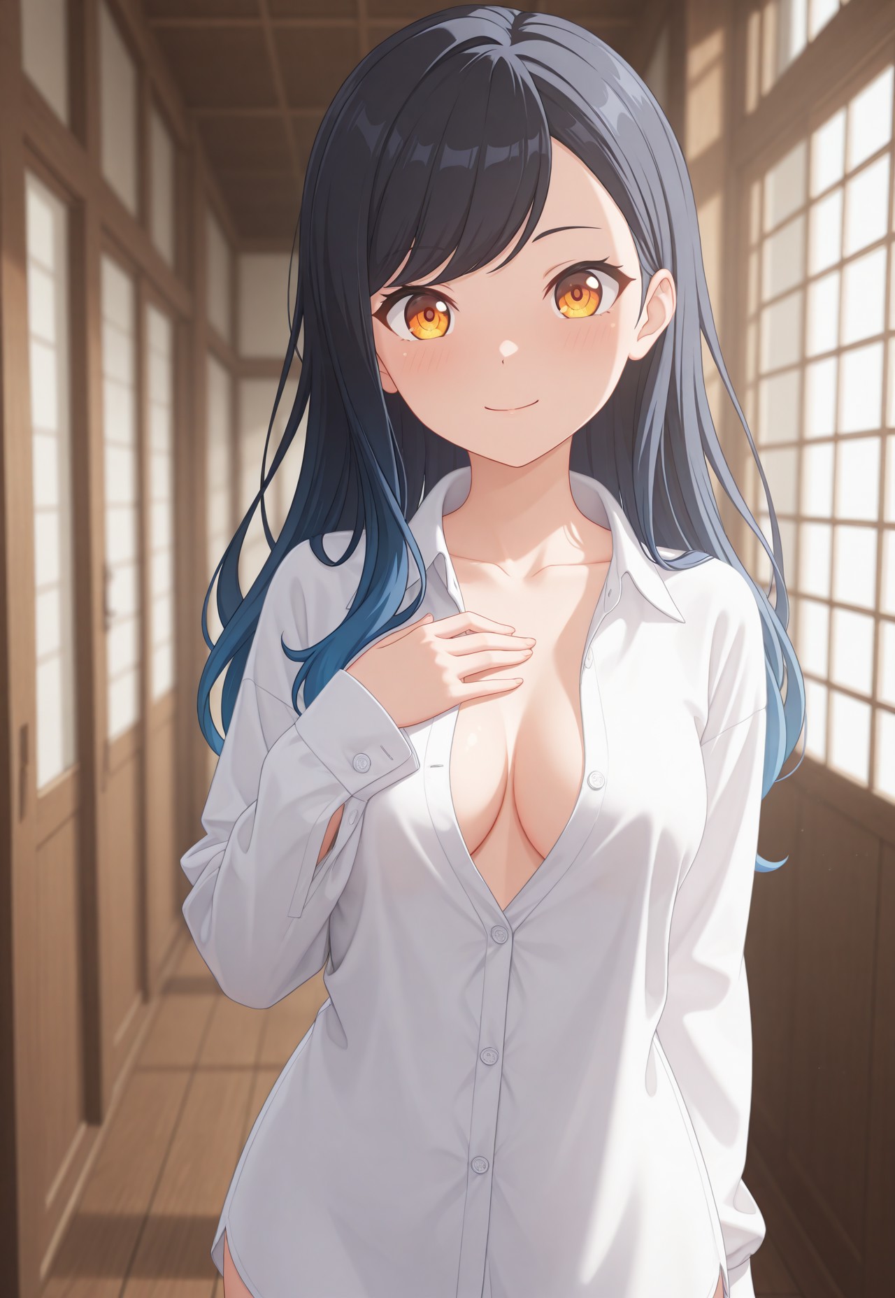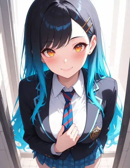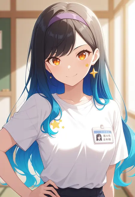 anchan, long hair, black hair, blue hair, gradient hair, multicolored hair, swept bangs