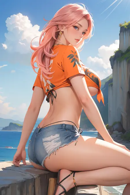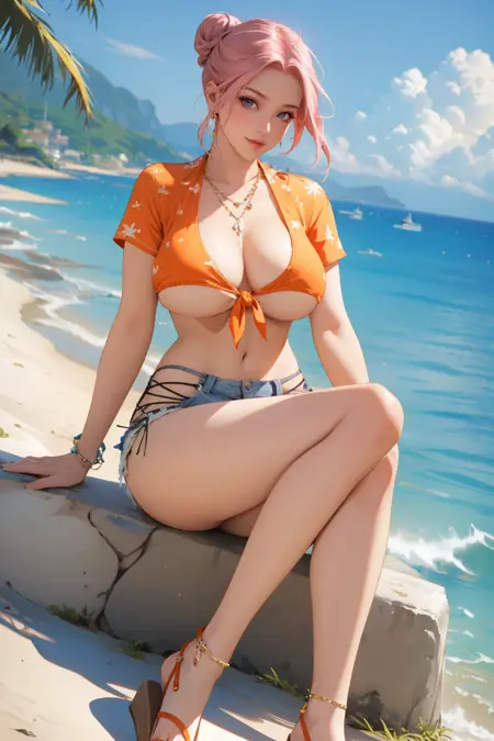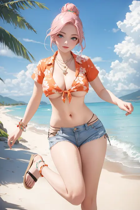 - Compatible with Loco Moco Vacation swimsuits. Added trigger words "orange hawaiian shirt,crop top,front tie,short sleeves,underboob,denim bikini shorts,necklace,anklet,sandals".