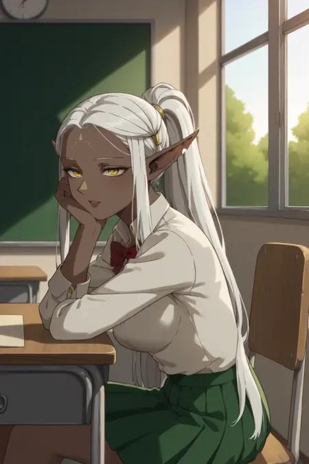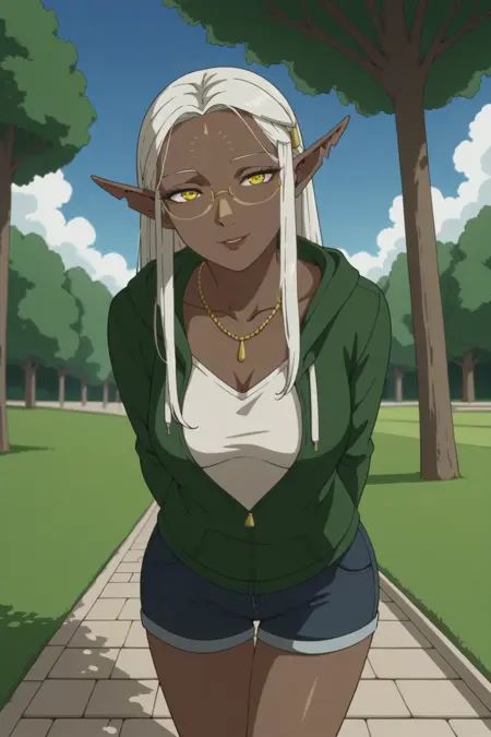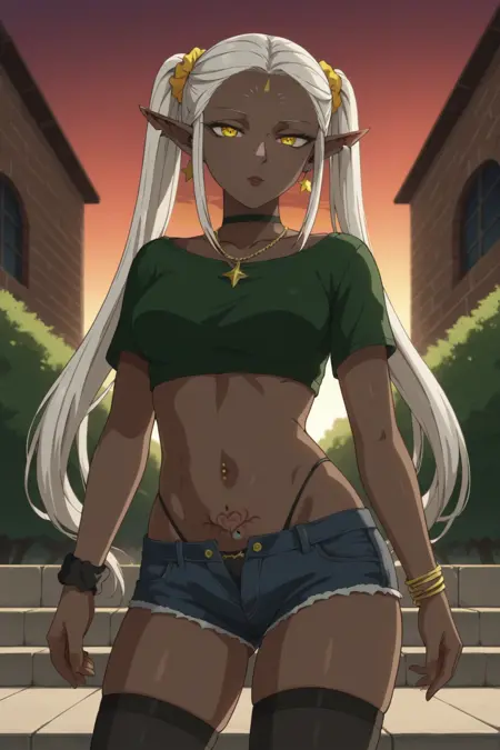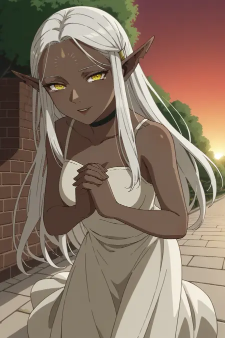 KJOcithis, dark elf, pointy ears, elf, forehead mark, white hair, long hair, notched ear, dark-skinned female,