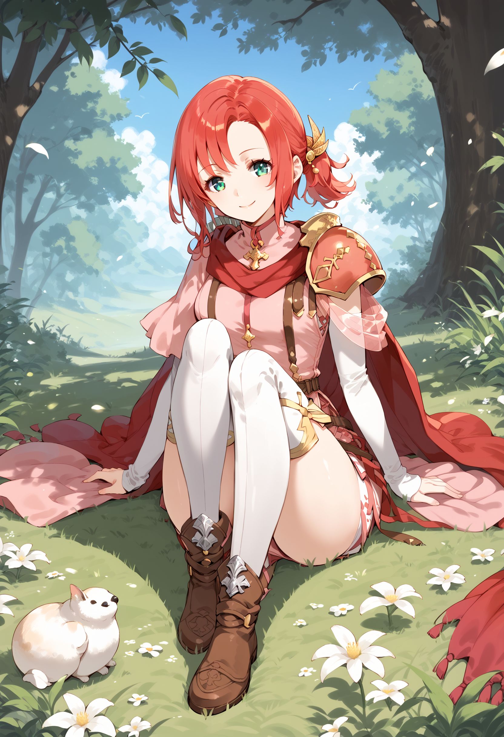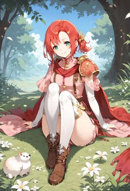 Add "hair ornament,shoulder armor,cape,red scarf,bridal gauntlets,pink dress,belt,thighhighs,boots" for her typical look.