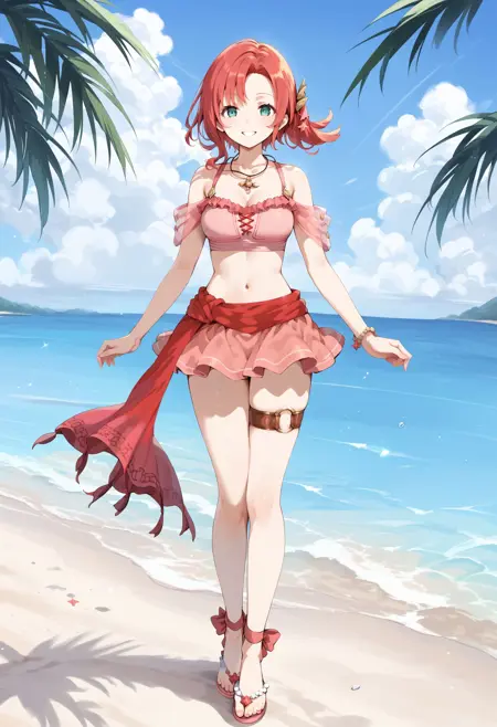 Add "summer hair ornament,necklace,pink bikini,bikini skirt,bracelet,thigh strap,leg ribbon,sandals" for her summer look.