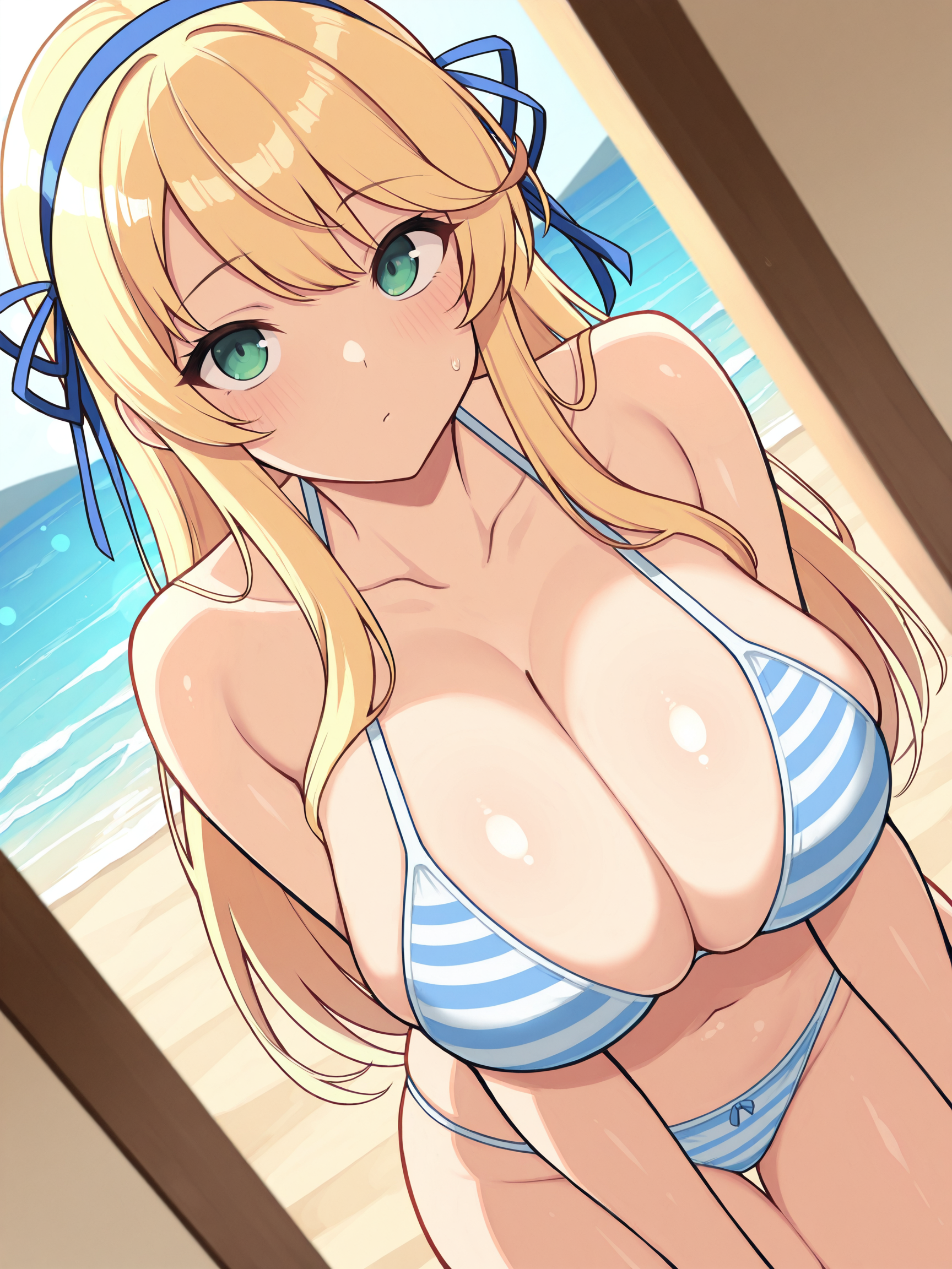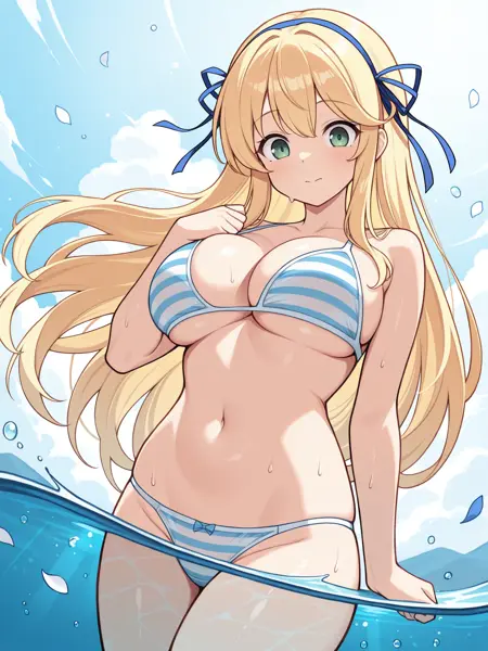 彼女の水着用トリガー語は**"Katsuragi_swim, 縞模様のビキニ, 縞模様のブラ, 縞模様のパンツ, 白と青のブラ, 白と青のパンツ"**です。