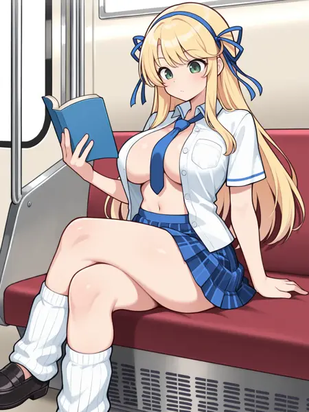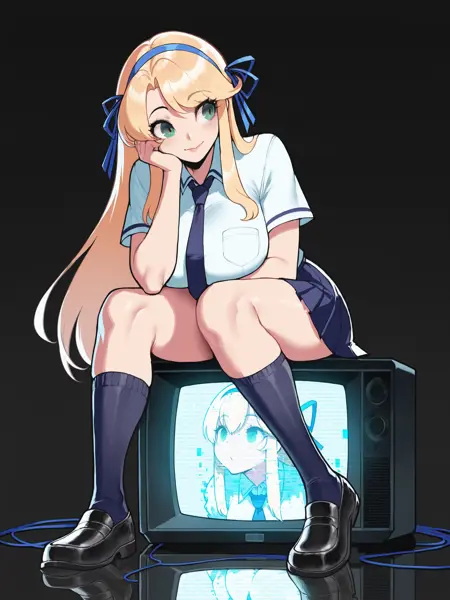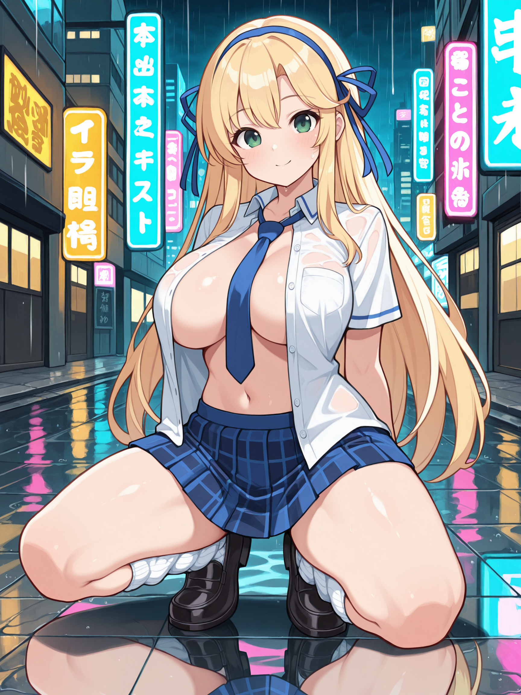 彼女の学校制服用トリガー語は**"Katsuragi_School, 学校制服, 青いネクタイ, ボタンを閉めた白いシャツ, プリーツスカート, 濃い青の膝上靴下, 黒いローファー"**です。