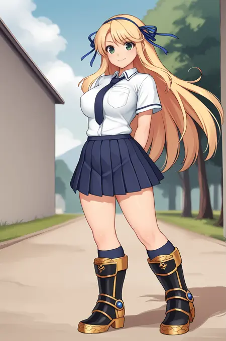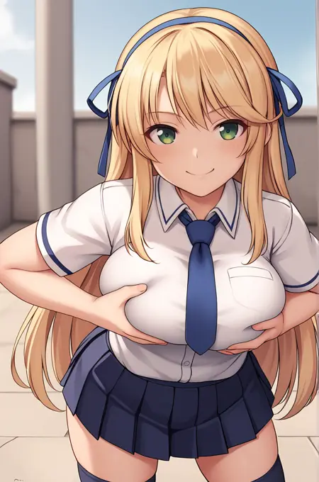 彼女の学校制服用トリガー語は**"Katsuragi_School, 学校制服, 青いネクタイ, ボタンを閉めた白いシャツ, プリーツスカート, 濃い青の膝上靴下, 黒いローファー"**です。