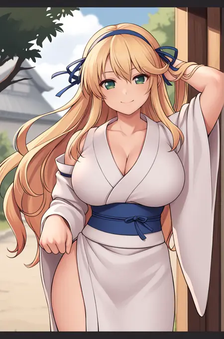 LoRAのトリガー語は**"Katsuragi_XL, 緑の目, 長い金色の髪, 青い髪リボン, ダブル髪リボン, 大きな胸"**です。