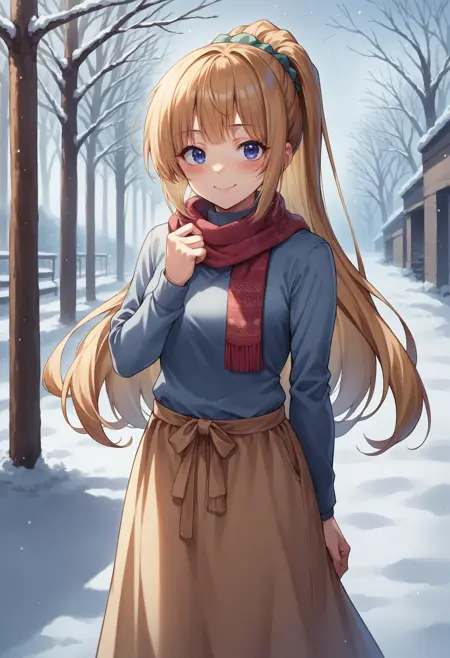 KaruizawaBase, ponytail, hair scrunchie, school uniform, blue shirt, bowtie, white skirt, red jacket, open jacket