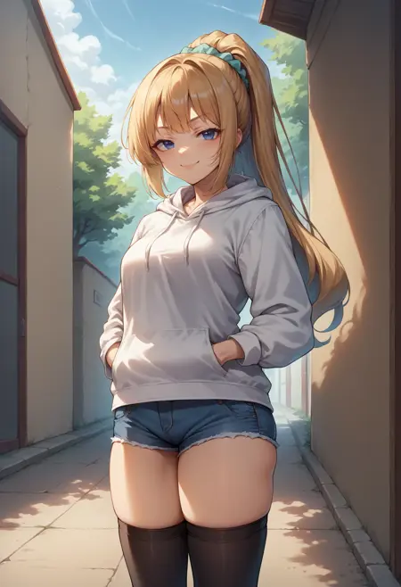 KaruizawaBase, ponytail, hair scrunchie, school uniform, blue shirt, bowtie, white skirt, clothes around waist