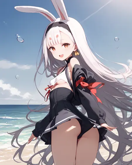 推荐正向:shimakaze \(azur lane\),兔耳,长发,棕眼,长发,极长发,白发,发带,露肩,黑色夹克,长袖,连衣裙,黑色高腰下装,红色丝带,手臂上的绿色丝带,乳下
