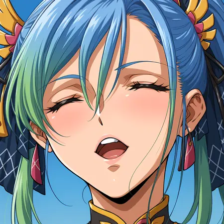 ポートレート - AZSRW、クローズアップ、ポートレート、AZSRW、青髪、口を開けた、多色髪、目と目の間の髪、グラデーション髪、緑髪、髪飾り