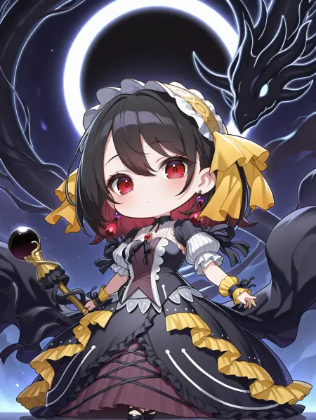 태그(옷): 검은 프린세스 드레스, 불룩한 짧은 소매, 노란 헤어밴드, 검은 프릴, 빨간 귀걸이, 노란 짧은 소매