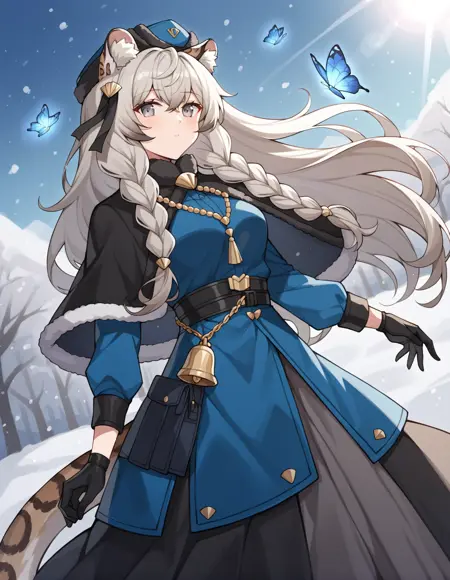 pramanix \(arknights\), 1girl, grey hair, long hair, very long hair, twin braids, grey eyes, leopard ears, animal ear fluff, leopard tail