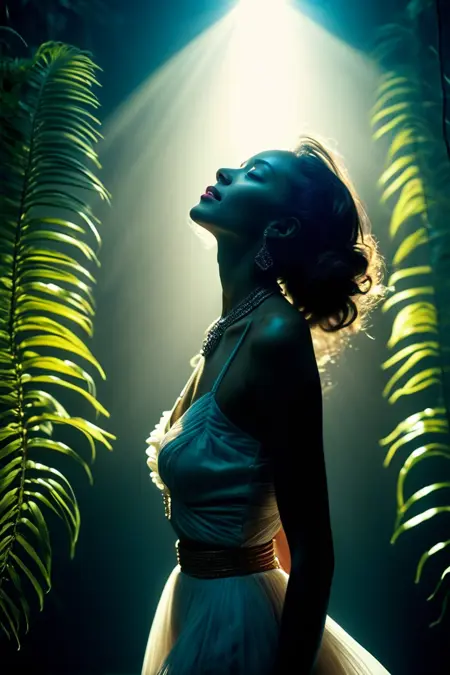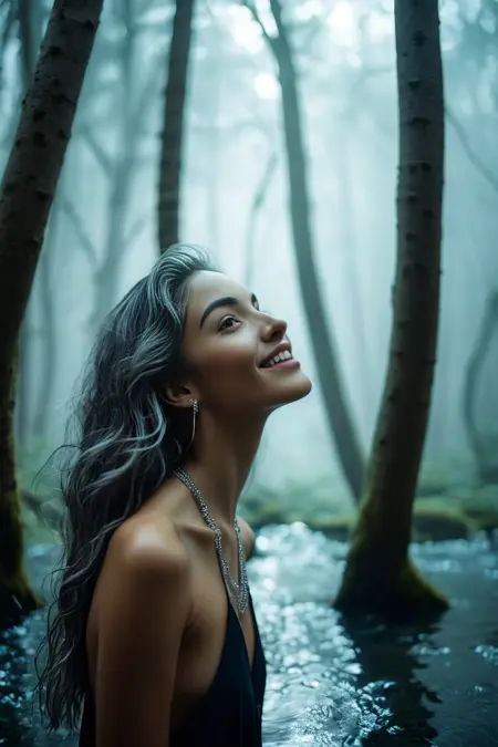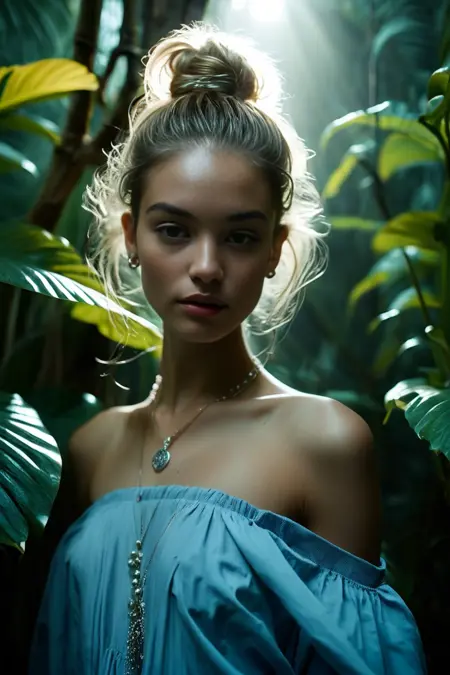 상징적인 펜던트가 달린 여러 층의 목걸이로 룩을 확장하여 당신의 개성을 강조하세요. 강렬한 눈빛은 매력적인 메이크업으로 더욱 돋보이며, 눈을 중심에 둡니다.