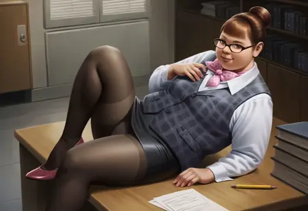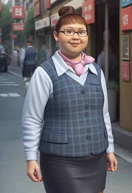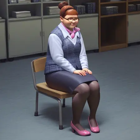 默认装扮为“眼镜、格子背心、衬衫、铅笔裙、丝袜、粉红色高跟鞋、波点蝴蝶结、单发髻”。
