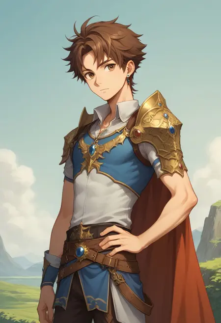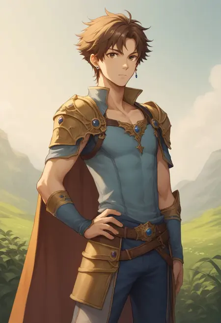 盔甲版: 巴兹,1个男孩,棕色头发,短发,棕色眼睛,首饰,耳环,盔甲,肩甲,斗篷,靴子,