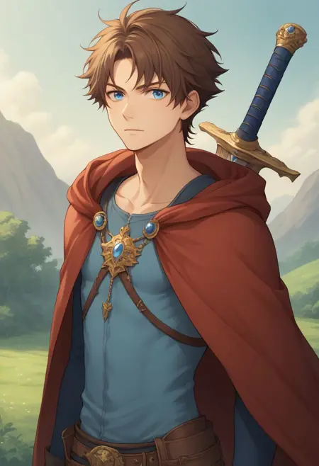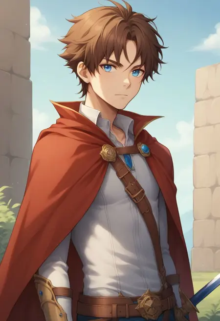 barklau,1个男孩,男性焦点,单人,蓝眼睛,棕色头发,衬衫,白色衬衫,翻领,长袖,束腰外衣,蓝色束腰外衣,斗篷,红色斗篷,腰带,