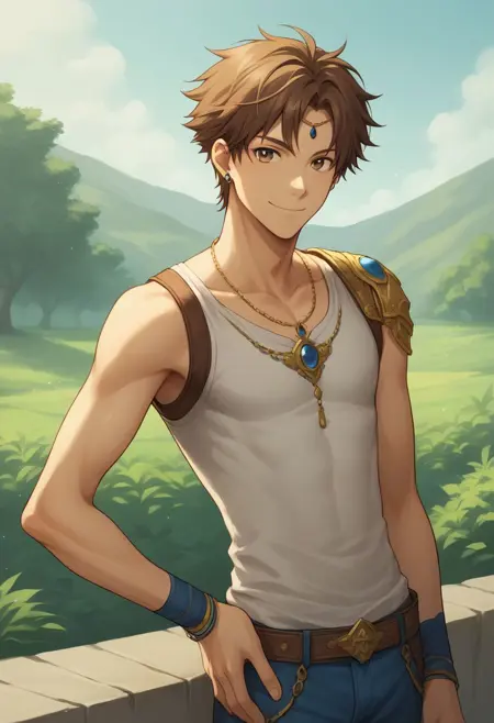 barklau,1个男孩,男性焦点,单人,蓝眼睛,棕色头发,头环,锁骨,衬衫,蓝色衬衫,无袖,斗篷,肩甲,手套,无指手套,单只手套,腰带,灰色长裤,裤脚塞进靴子,靴子,
