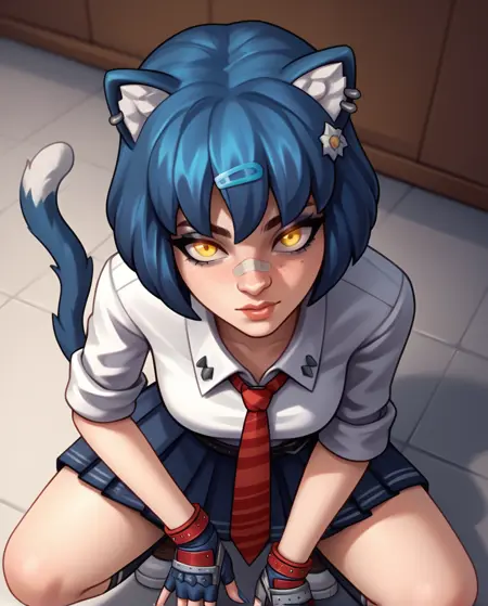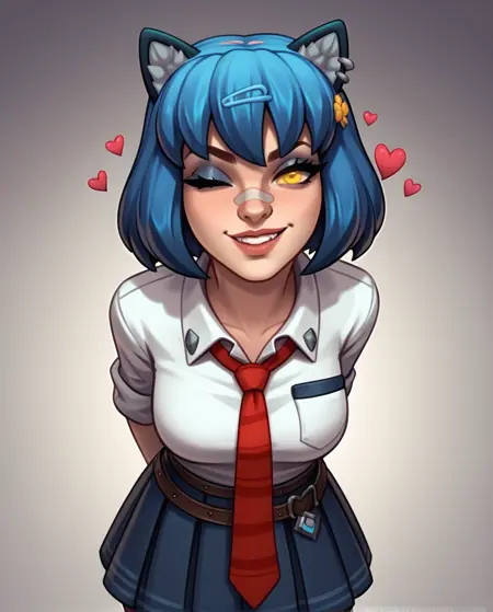 Triggers for Schoolyard Maeve: school_maeve, schoolgirl maeve outfit, bandaid on nose, blue gloves, glowing yellow eyes