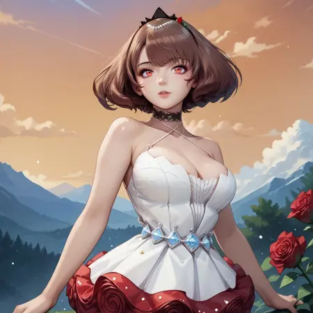 Default outfit: defaultanna, headress, choker, white dress, roses, skirt