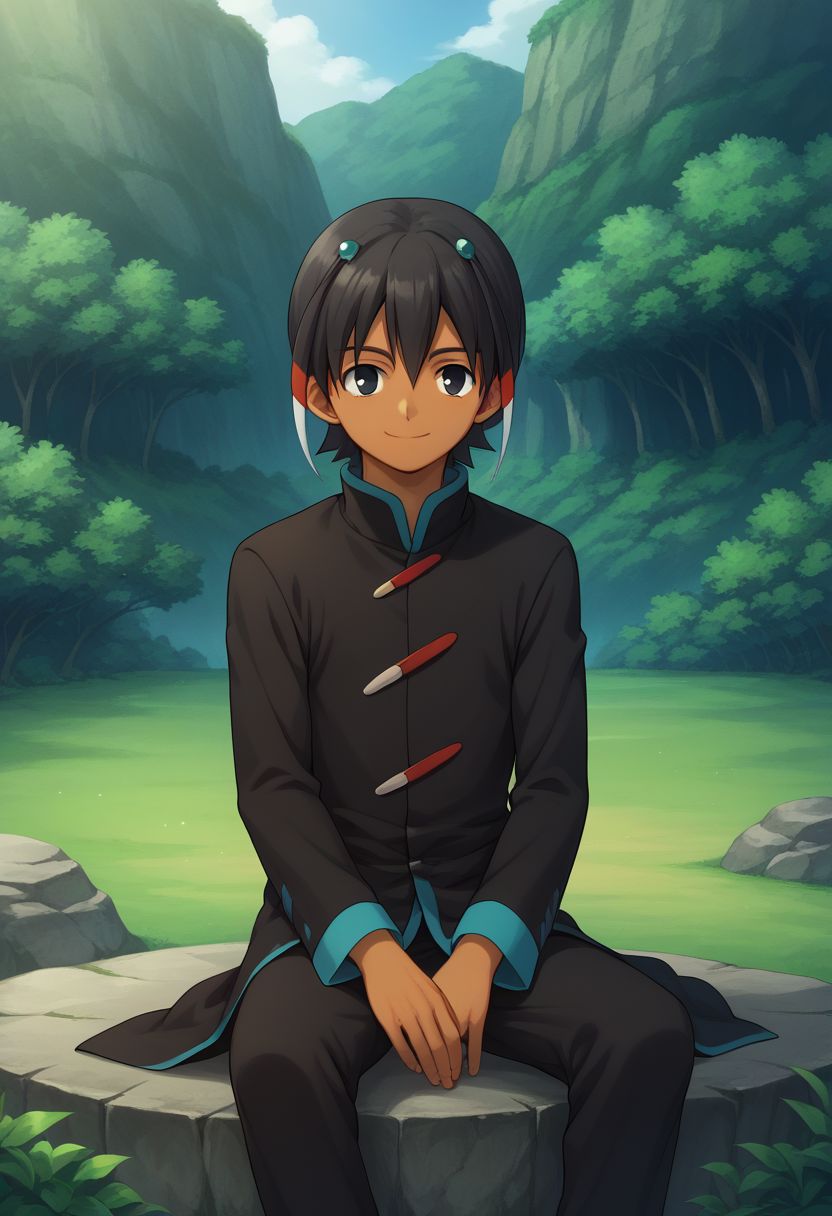 shutez, 1boy, 남성 중심, 단독, 검은 피부, 검은 피부를 가진 남성, 검은 눈, 검은 머리, 머리 장신구, 재킷, 검은 재킷, 긴 소매, 바지, 검은 바지, 신발, 갈색 신발