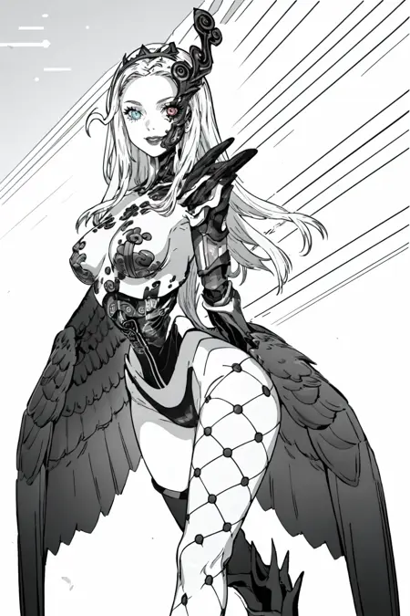 デフォルトの外見: ナーマ、長い髪、色付きの肌、ハーフマスク、虹彩異色症、リップストック、ヘアバンド、黒い翼、サイボーグ、機械式の腕、フィッシュネット手袋、非対称な手袋、フィッシュネット、非対称な脚部装着