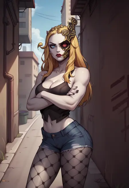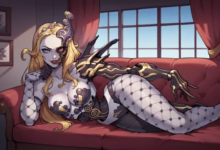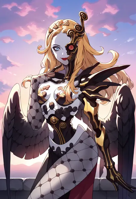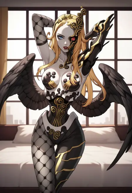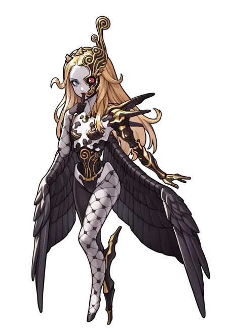 デフォルトの外観: ナーマ、長い髪、色付きの肌、半マスク、虹彩異色症、リップストック、ヘアバンド、黒い翼、サイボーグ、機械的な腕、フィッシュネット手袋、非対称な手袋、フィッシュネット、非対称な脚衣、機械的な脚
