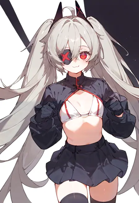 标签:失败(djmax),1个女孩,长发,双马尾,灰发,眼罩,红眼,极长发,头发遮眼,手套,呆毛,长袖,过膝袜,白色比基尼,黑色短裙