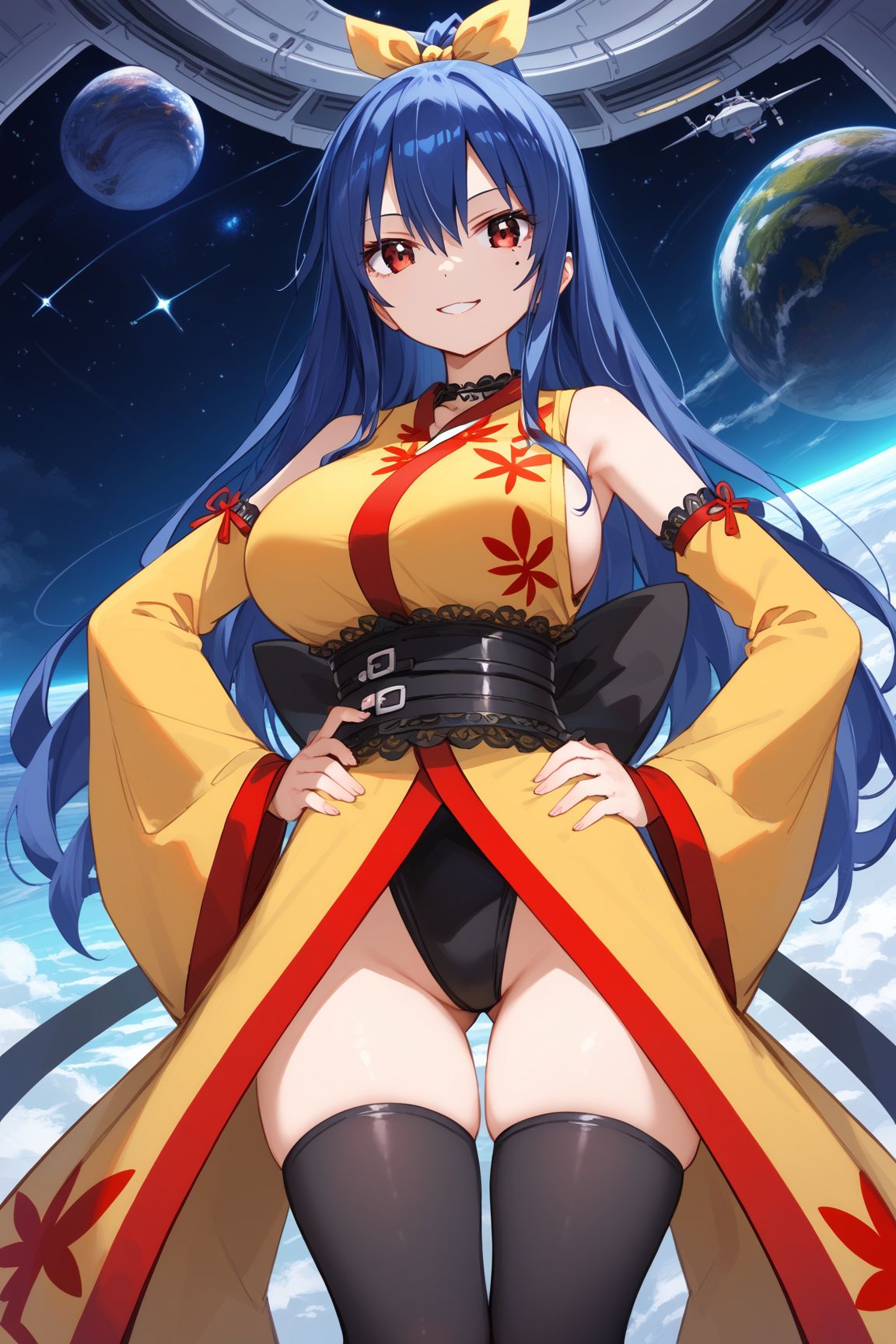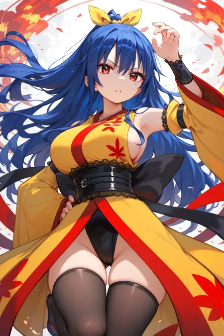 yellow kimono, leaf print, detached sleeves, sash, black thighhighs