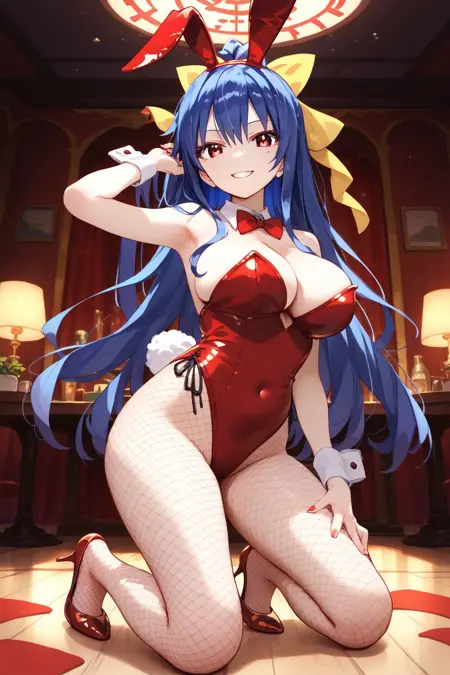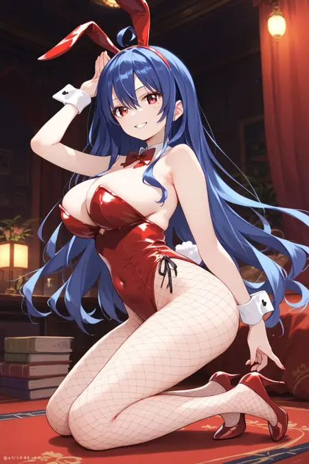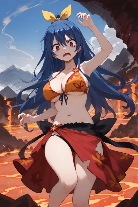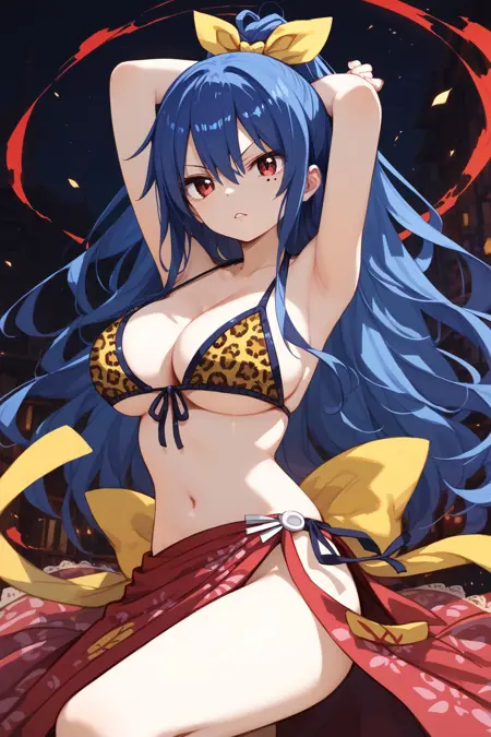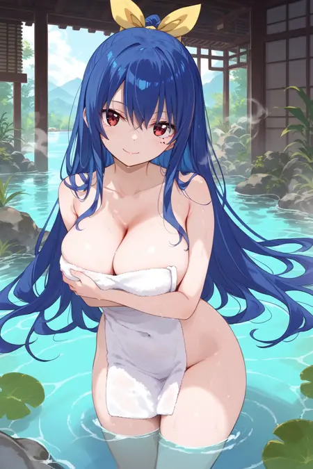 homura, solo, 1girl, red eyes, mole under eye, blue hair, long hair, ponytail, hair ribbon