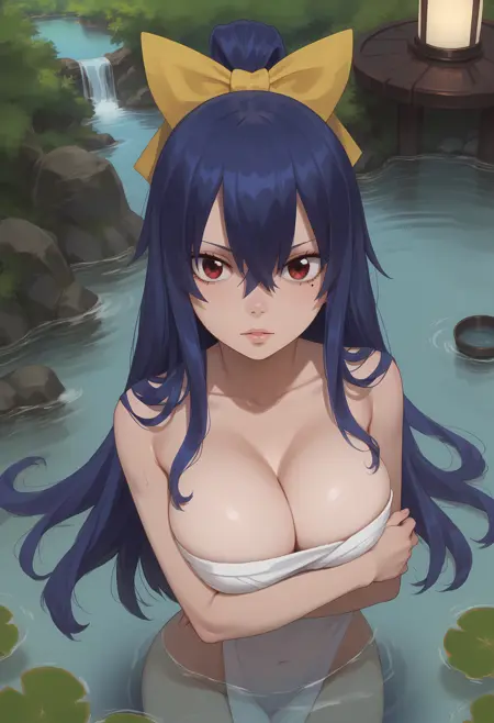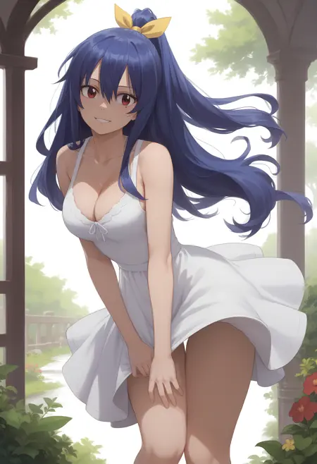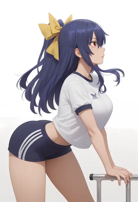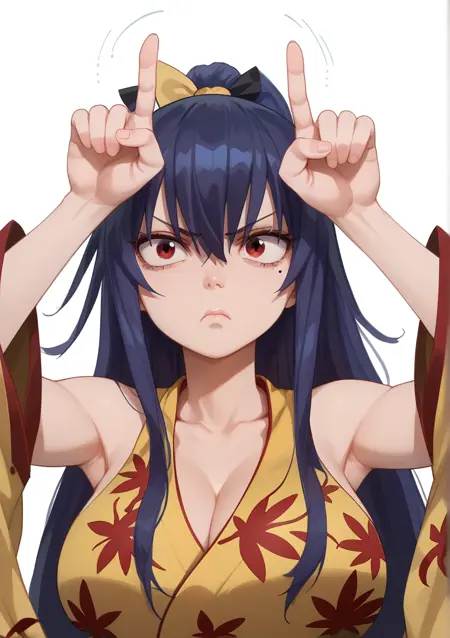 homura, 1girl, red eyes, mole under eye, blue hair, long hair, high ponytail, hair ribbon