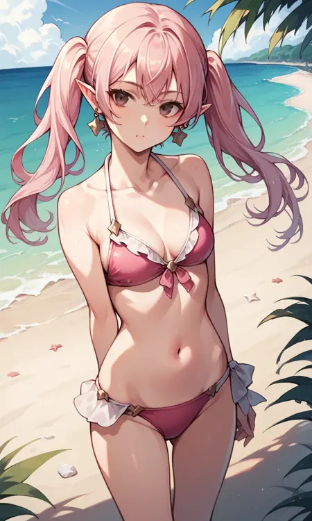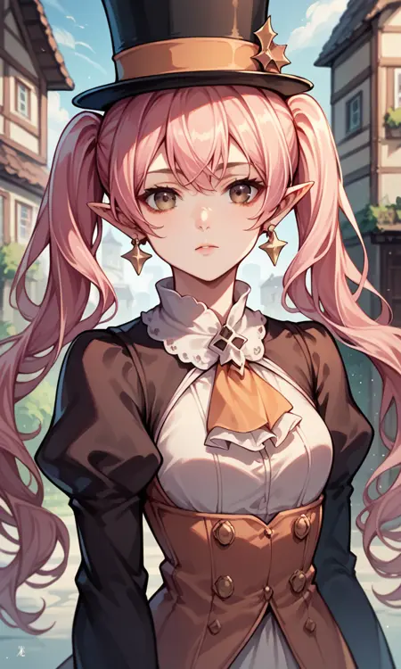 dolce,brown eyes, pointy ears, top hat, earrings, pink hair, twintails