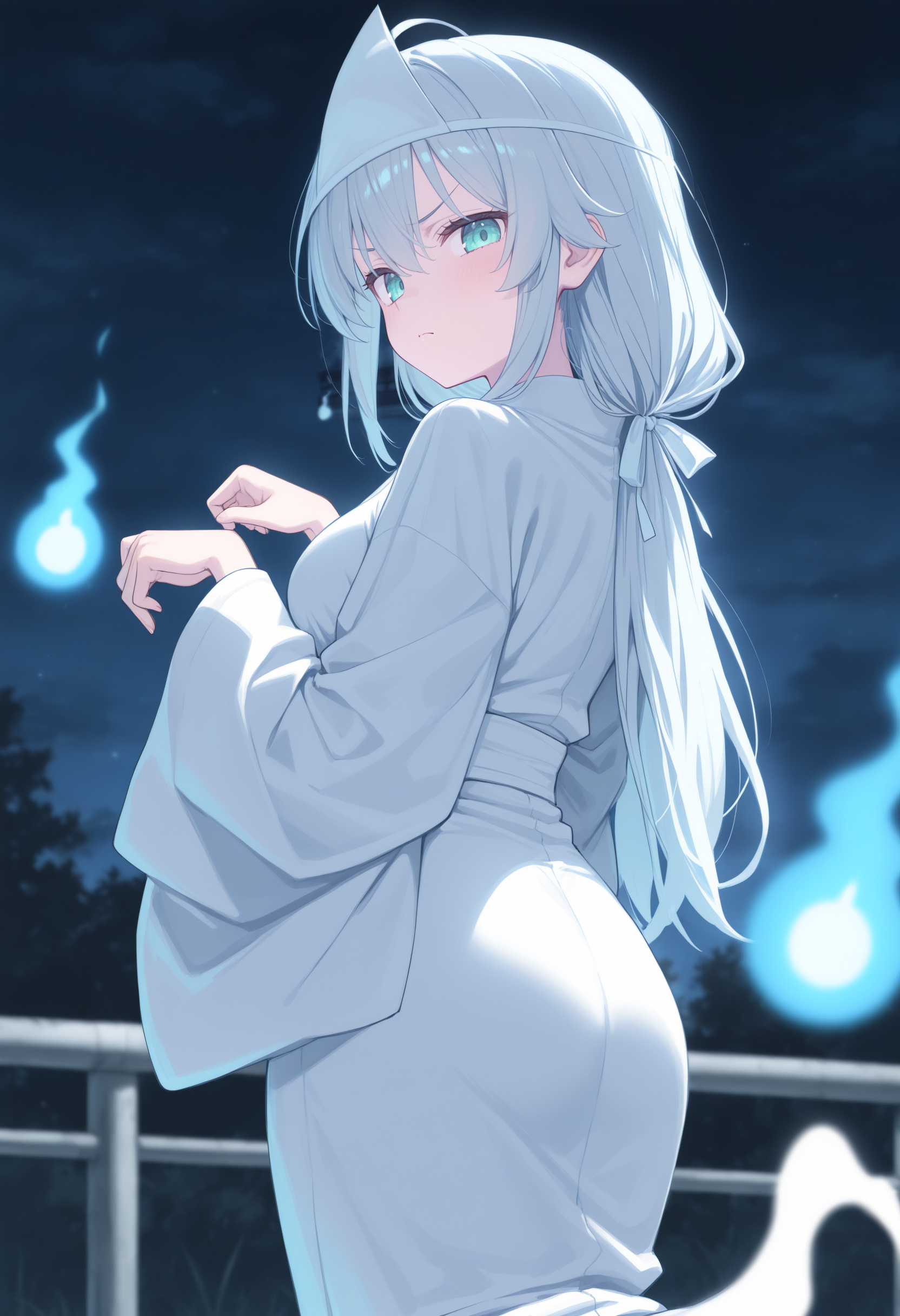 頭の頭巾だけ欲しくて服は生前の格好をさせたい場合は triangular headpiece の方を、白い服を着せたいだけなら shiroshouzoku の方を、どちらも欲しいなら両方入れてください。幽霊っぽさを出すなら hitodama, ghost pose で人魂が出たり手を前に出してだらんとさせます。 japanese clothes, ghost, ghost costume 辺りはお好みで。