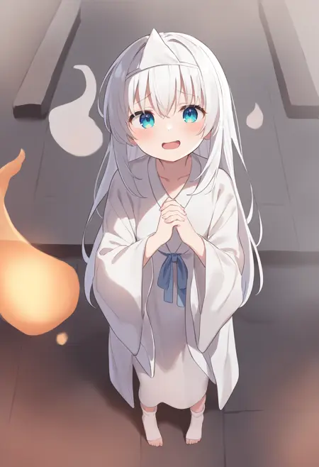 若只想添加头巾而保留死者生前的穿着,请使用 triangular headpiece;若只想让其穿上白色丧服,请使用 shiroshouzoku;若两者都需要,请同时使用两者。若想增强幽灵氛围,可搭配 hitodama 和 ghost pose,以生成人魂并让手臂无力前伸。japanese clothes、ghost、ghost costume 等可根据喜好自由使用。