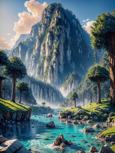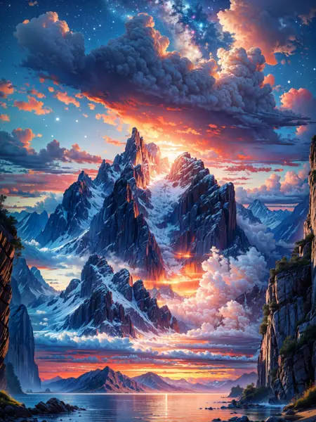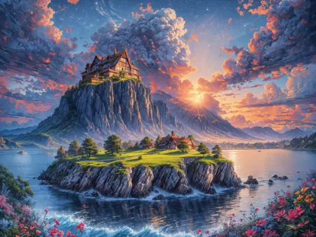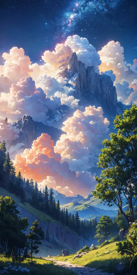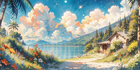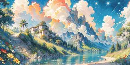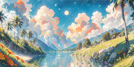 scenery,sky,cloud,tree,blue sky,day,cloudy sky,nature,water,grass,house,mountain,rock,flower,building,forest,plant,bird,star \(sky\),ocean,night ,starry sky,landscape,night sky,window,horizon,path,bush,door,moon,road,beach,mountainous horizon,river,reflection,sunlight,potted plant,sunset,cliff,full moon,lantern,palm tree,sand ,stairs,summer,field,architecture,