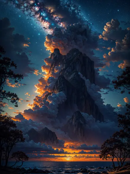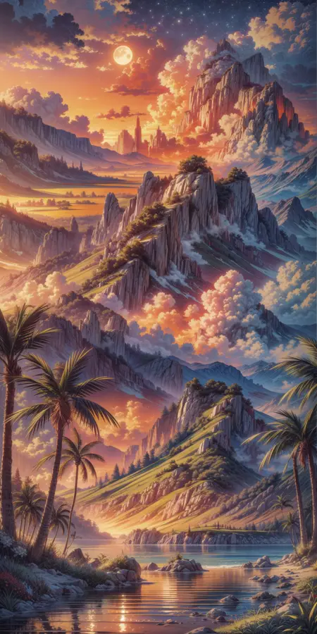 scenery,sky,cloud,tree,blue sky,day,cloudy sky,nature,water,grass,house,mountain,rock,flower,building,forest,plant,bird,star \(sky\),ocean,night ,starry sky,landscape,night sky,window,horizon,path,bush,door,moon,road,beach,mountainous horizon,river,reflection,sunlight,potted plant,sunset,cliff,full moon,lantern,palm tree,sand ,stairs,summer,field,architecture,